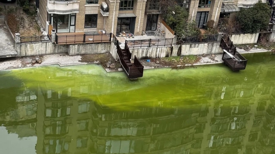 小区的景观湖,本该是居民们茶余饭后散步赏景的好去处。可昨天,家住康城小区二期的多位市民向“新民帮侬忙”栏目反映,原本清澈的湖水,却被大面积地染成绿色。究其原因,竟是装修工人蹲在湖边洗油漆桶。这让业主们大为光火。